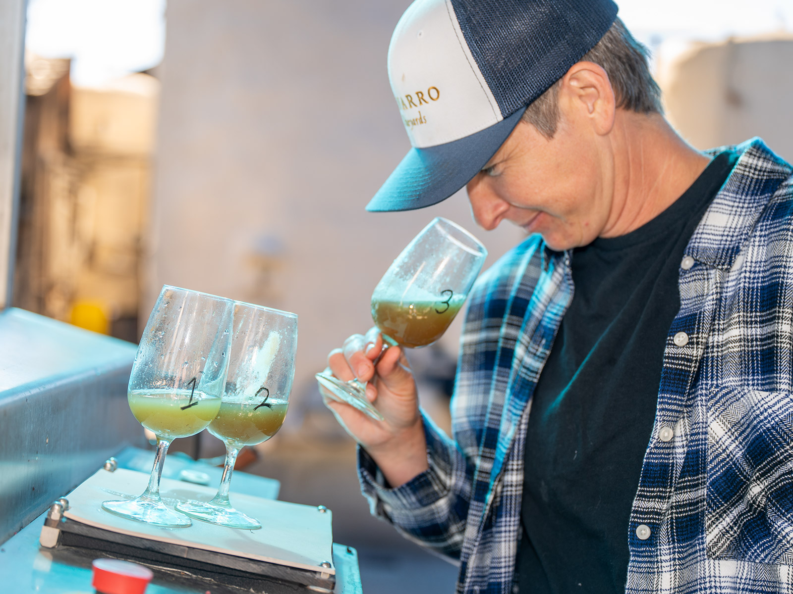 [above] We've found that letting the juice and skins macerate on destemmed Gewürztraminer grapes increases the aromatics and flavor concentration. The grapes should be cold for best results and we taste the juice every hour to make sure we aren't picking up unwanted harsh skin phenolics. Sarah retains the juice from each hourly segment to determine the optimum press time; she is pictured here tasting juice with three hours of maceration time.