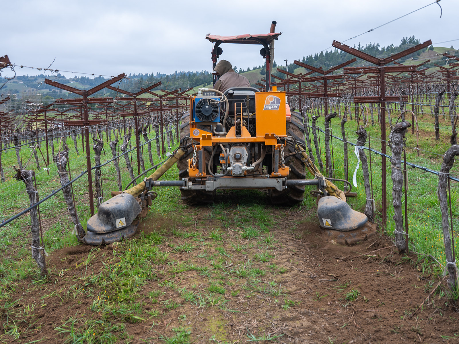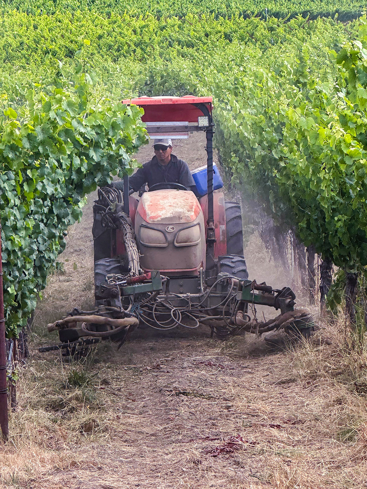 [above] Removing weeds in our West Hill Gewürztraminer block. We remove weeds mechanically at Navarro (we're herbicide free!) but we have about 500,000 feet of trellis so it's a time-consuming process. In the early part of the season, we use the “twister,” a rototiller-like contraption that digs out the weeds (above). Later in the season, when the grasses have regrown and dried out, we mow them with our “kick-mower” (right).