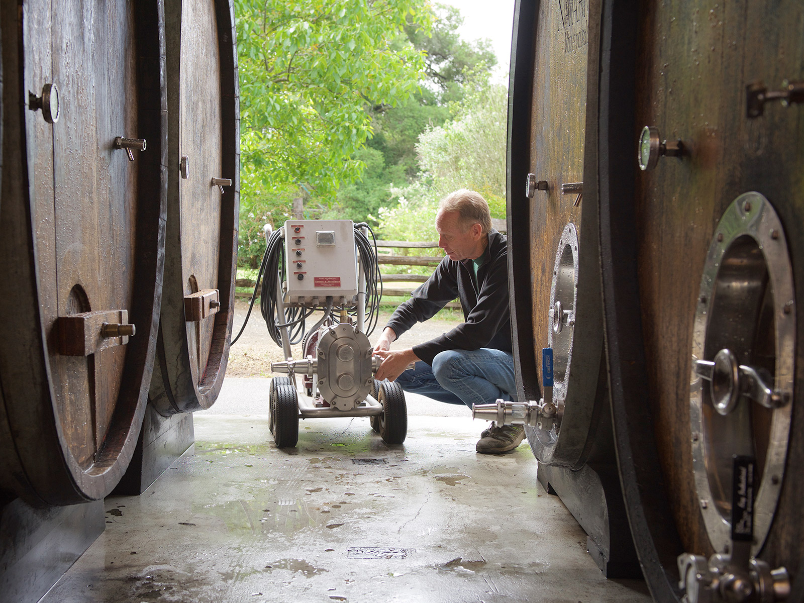 Jim setting up a pump. We fermented and aged Pinot Gris sur lie in these French oak ovals
