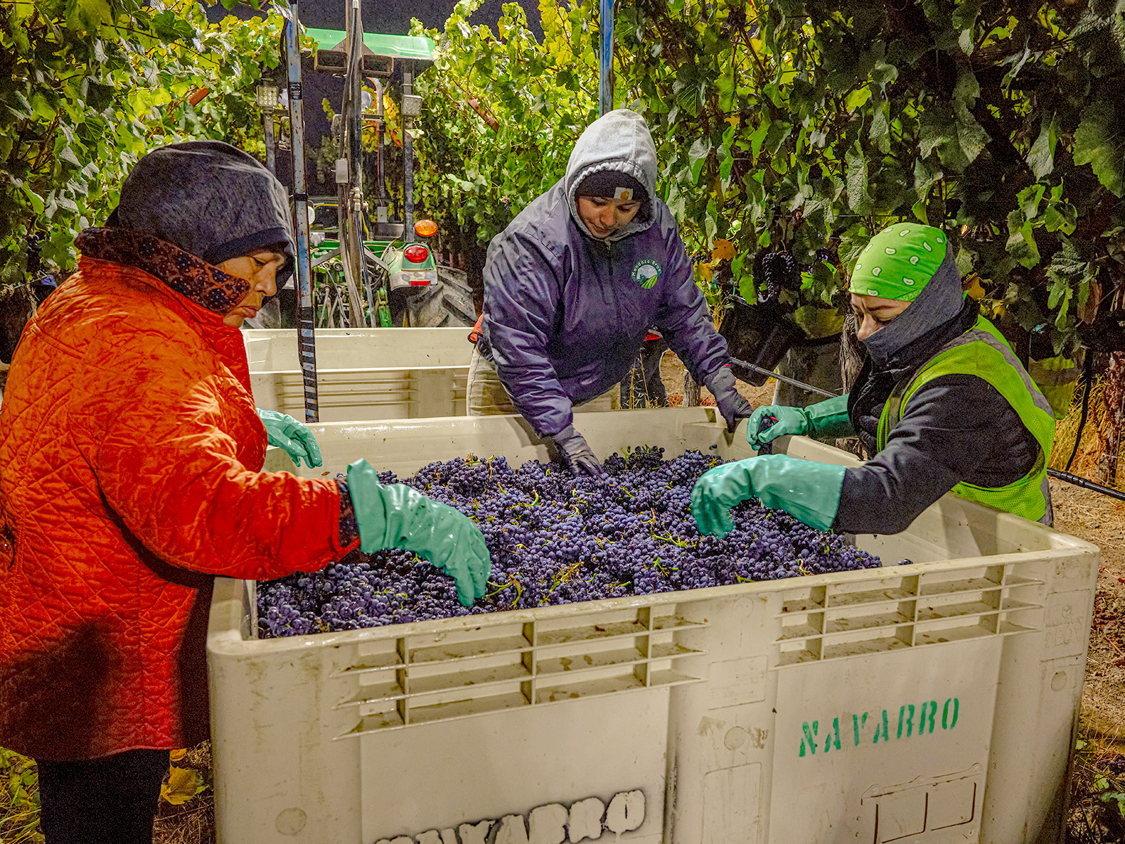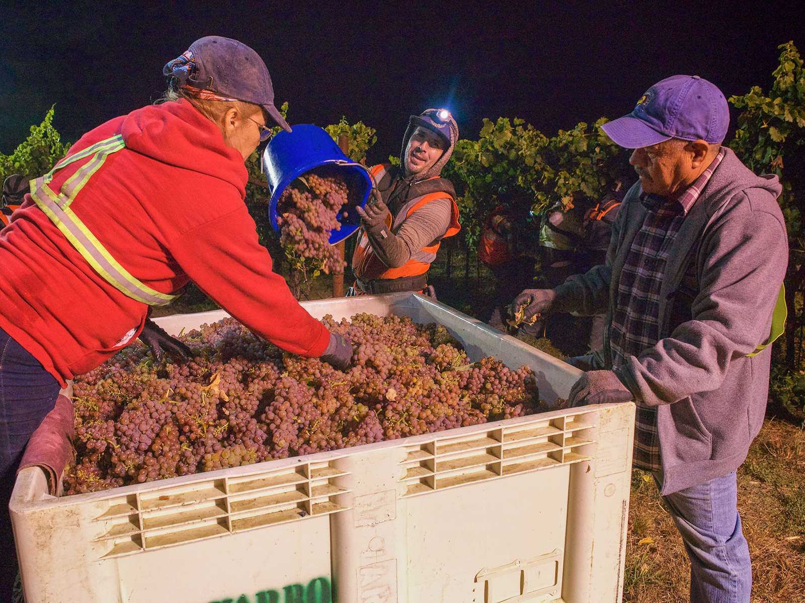 We night harvest the fruit cold to inhibit fermentation but keep Pinot Noir must on the skins to pick up color and flavor. We press the same day to make sure we avoid any alcoholic fermentation; consequently the juice is lighter in color than the red wine (which we leave with the skins for about a week).