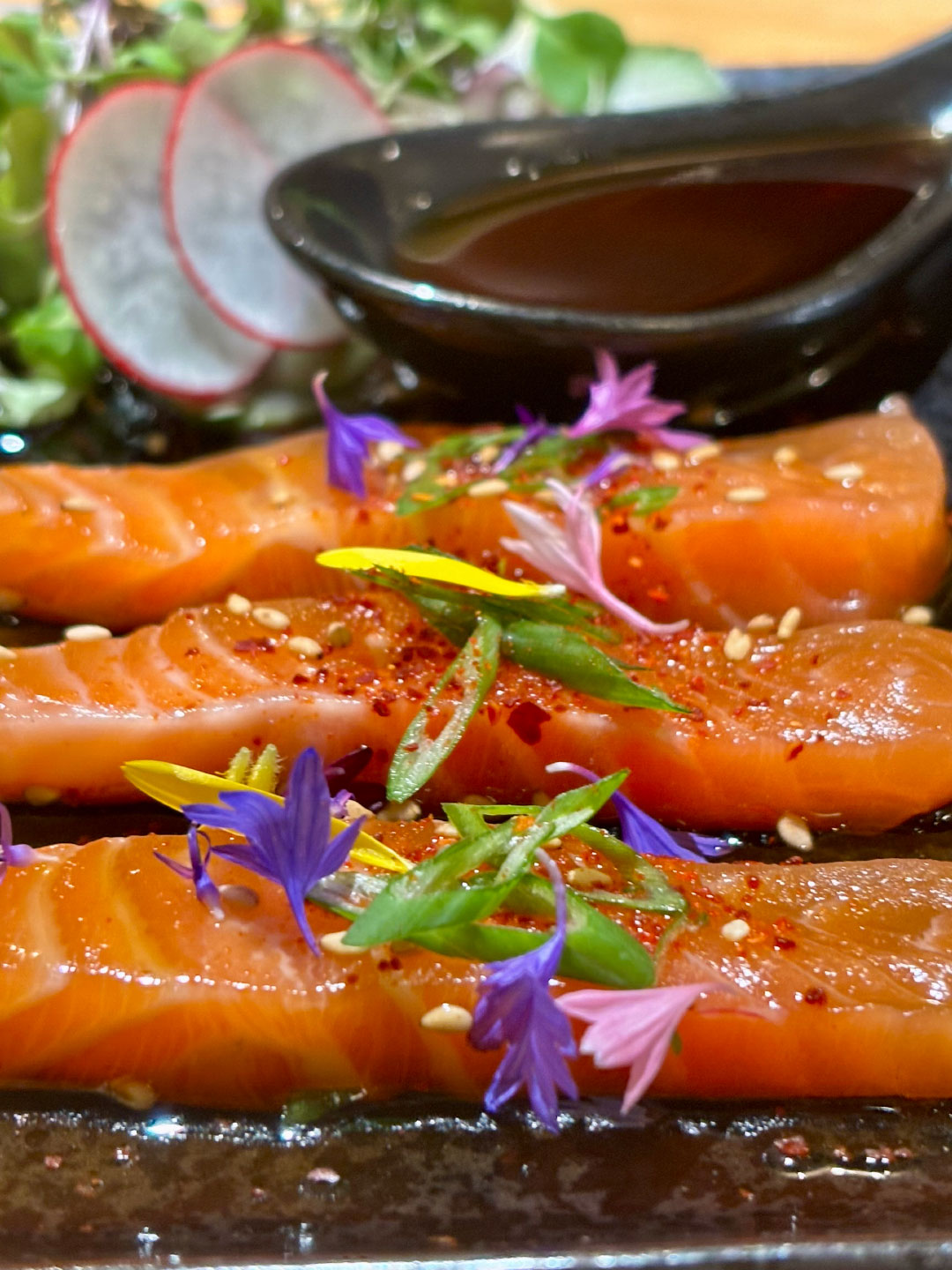 Slice cured salmon into 1/4-inch sashimi slices. Serve 4–6 oz per person.
